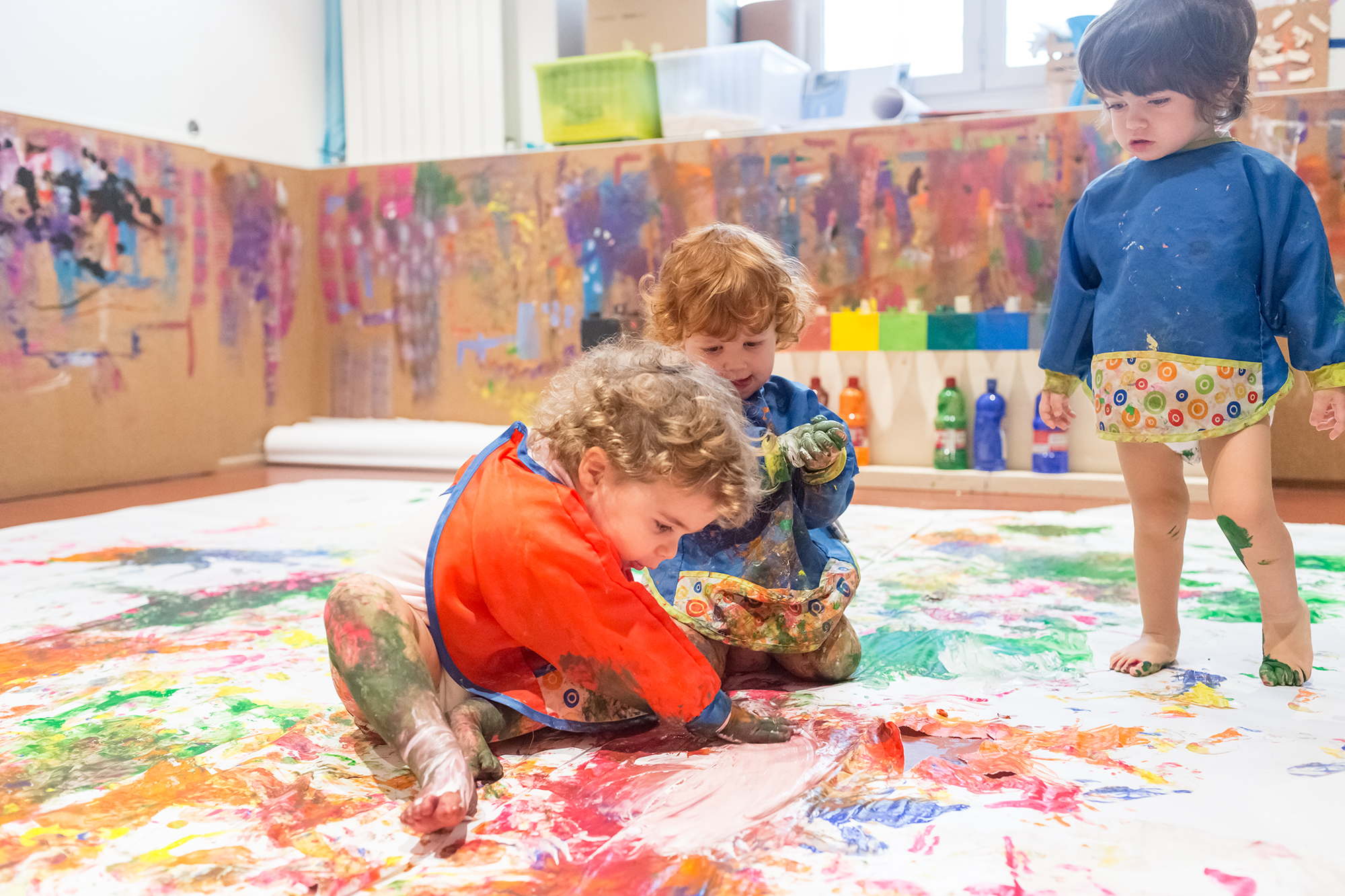 Un divertente labororatorio che unisce l'utilizzo del colore a quello di particolari supporti sui quali lasciare traccia, macchinine che affondano le ruote nel colore, che si lanciano da inattese pendenze, rulli, supporti rotanti, palline che scivolano nel colore lasciando sorprendenti sfumature. Corpi che si muovono lasciando la scia del proprio passaggio.